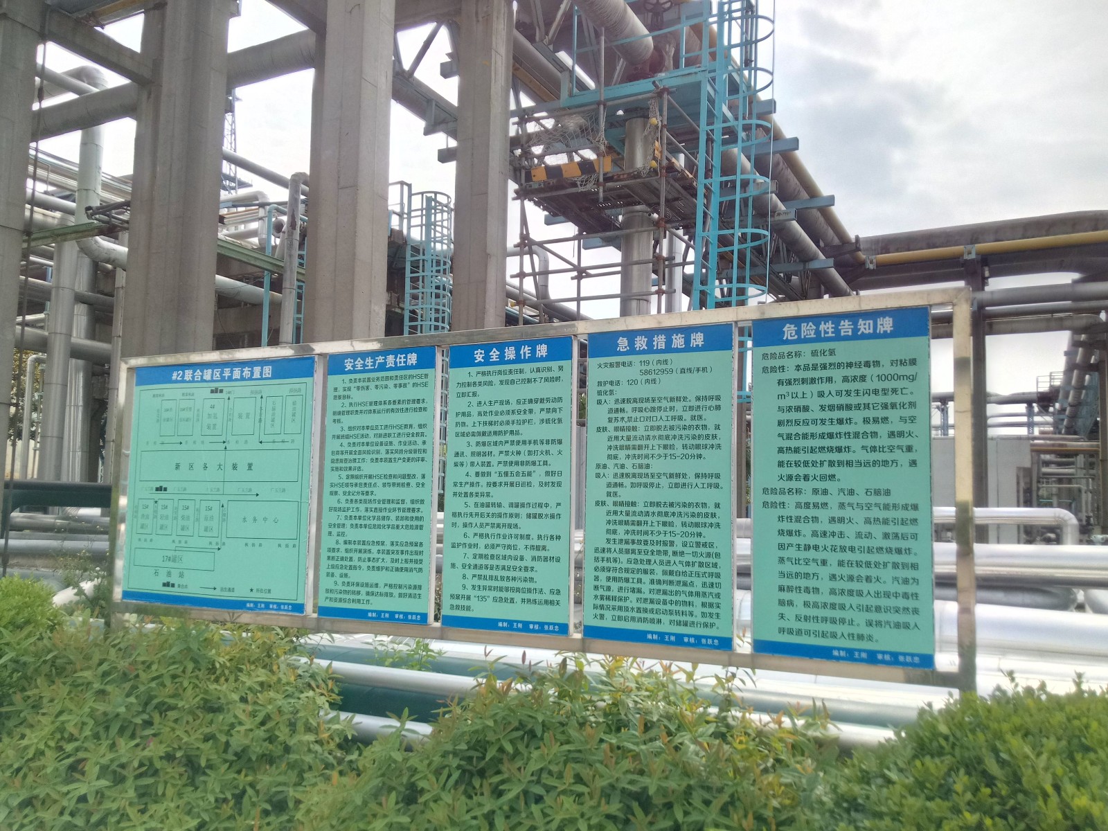 地理位置及周邊環境: 中國石化上海高橋石油化工有限公司生產區域分為高橋老區和漕涇新區,其中高橋老區位于高橋老工業基地城鎮工業用地,漕涇新區位于上?;瘜W工業區。 1#聯合罐區處于煉油區域內。其東側為氣加硫磺裝置、堿渣儲罐、催化劑倉庫、2#重整聯合裝置,南側為污水處理裝置、黃浦江,東南側為煉油綜合大樓,西側為石油站罐區,西北側為2#聯合罐區,北側為3#硫磺回收裝置、140萬噸/年加氫裂化裝置。 2#聯合罐區地塊位于上海高橋石化內部北側位置,由五個區域組成, 16#罐區(分2處)、15#罐區、17#罐區、三苯罐區,罐區分布比較分散。16#罐區分為2部分,東側都靠近浦東北路,路對面為居民區;西側為廠內道路香樟路,路對面為2#重整加氫裝置、3#催化裝置、3#加氫裝置;北側靠近中高公路,公路對面為東生供用電器材廠;南側為廠內道路。16#罐區2部分之間為4#加氫裝置和3#催化裂化裝置。15#罐區位于聯合罐區中部,北側為廠內道路梧桐路,再往北為中高公路;東北側為廠內道路廣玉蘭路,路對面為1#延遲焦化裝置和2#重整加氫裝置;東南側為廠內道路石榴路,石榴路對面為新硫磺裝置;西南側為廠內道路楓揚路,路對面為3#污水。17#罐區位于2#聯合罐區最西部,其東面為廠內道路楓揚路及15#罐區;南側為石油站罐區;西面為廠內道路;北側為空地,空地以北為居民小區。三苯罐區東北面是中石化加油站,再往東北面是浦東北路,南面是廠內道路,西面是管架、香樟路,西北面是倉庫和地磅。 #4聯合罐區北部東側為油管路,隔路為海武輪胎有限公司;南部東側為凌海路,隔路為中國(上海)自由貿易試驗區;南側為外環高速;西側為曹家浜路,隔曹家浜路為空地;北側為高三港。 #5聯合罐區位于浦東北路3270號,東側為居民小區南新西園;南側為速通物流上海外高橋網點、高西村委會、家家樂公寓;西側為浦東北路,隔路為立昌三堆場;北側為上海燕錦物流有限公司;西北為上海杜邦農化有限公司 | |
